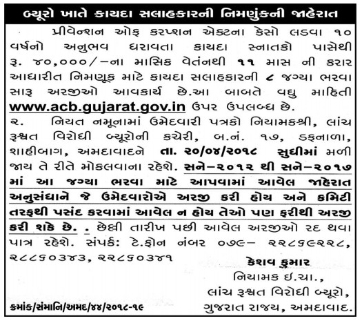 Anti Corruption Bureau has published the notification for recruitment for the post of Adviser Posts There are a total of Vacancy in Anti Corruption Bureau Recruitment for Revenue Adviser Post 2018. has published Advertisement for below mentioned Posts 2018. Other Details like No.Of Posts, Educational Qualification, Age Limit, Selection Process, Application fee and How to Apply are given below. Must Read Official Advertisement than Apply for this Post.Best Of Luck. Thanks for Visit Gujarati Education