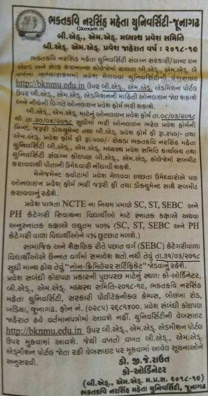 - Bhakta Kavi Narsinh Mehta University B.Ed / M.Ed Admission Form Filling Starting Date : 08-03-2018