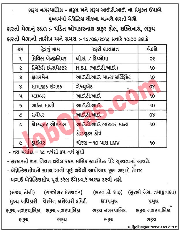 Bharuch Nagarpalika Recruitment for 70 Apprentice Posts 2018 (Apprentice Job Fair)