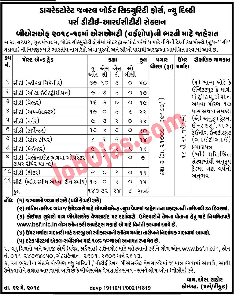 Border Security Force (BSF) has published the notification for recruitment for the post of SMT (Workshop) Technical Posts There are a total of 207 Vacancy in BSF Recruitment for SMT (Workshop) Technical Posts 2018. has published Advertisement for below mentioned Posts 2018. Other Details like No.Of Posts, Educational Qualification, Age Limit, Selection Process, Application fee and How to Apply are given below. Must Read Official Advertisement than Apply for this Post.Best Of Luck. Thanks for Visit Gujarati Education