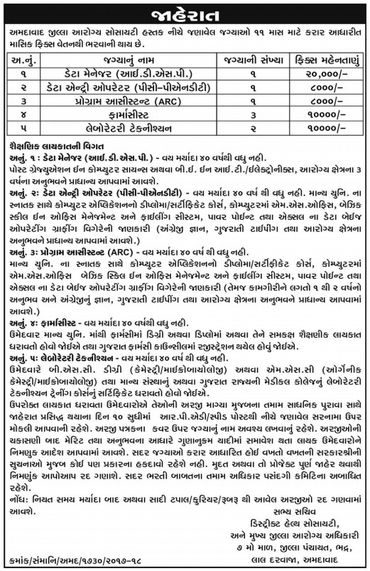 District Health Society Ahmedabad Recruitment for Data Manager, Data Entry Operator & Other Posts 2018