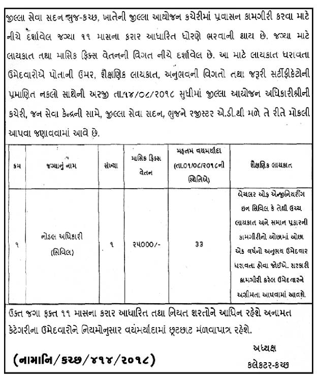 District Planning Office, Bhuj – Kutch Recruitment for Nodal Officer Post 2018