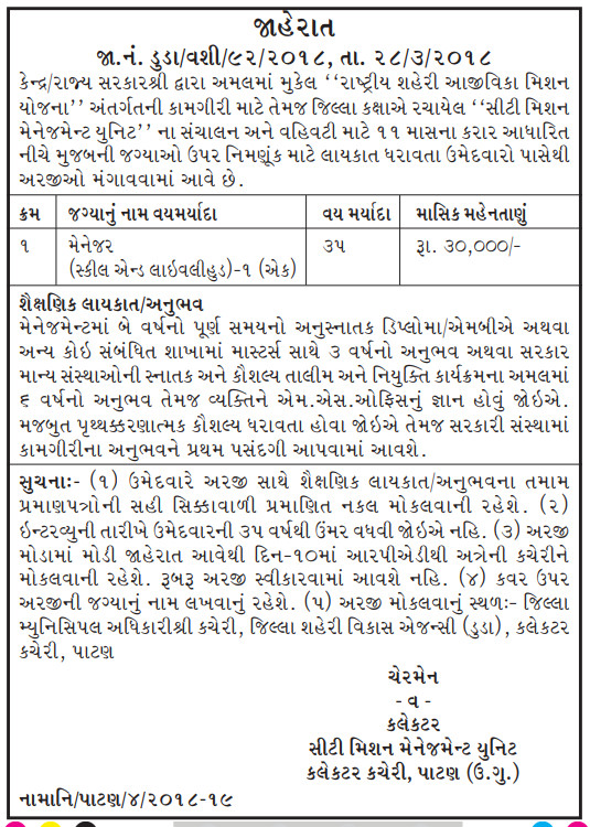 DUDA Patan Recruitment for Manager (Skill and Livelihood) Post 2018