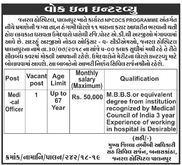 General Hospital Palanpur Recruitment for Medical Officer Post 2018