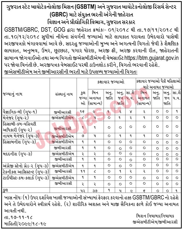 Joint Recruitment of Gujarat State Biotechnology Mission (GSBTM) & Gujarat Biotechnology Research Centre (GBRC); Dept. of Science & Technology, Govt. of Gujarat, Gandhinagar