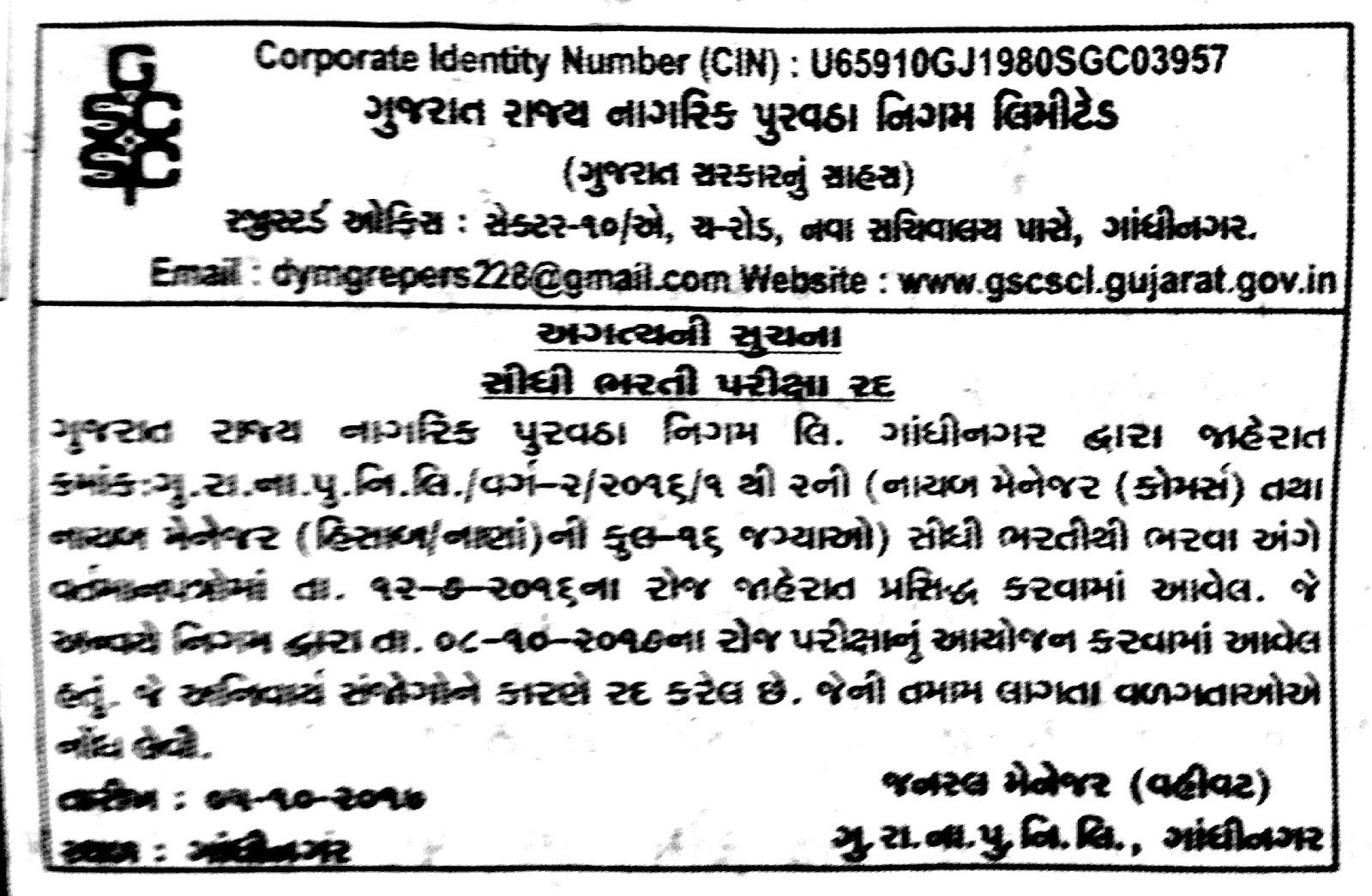 GSCSCL Deputy Manager Exam Cancellation Notification 2017