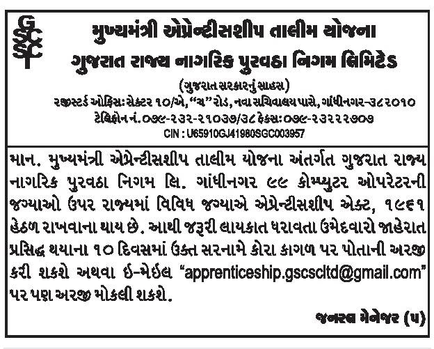 Gujarat State Civil Supplies Corporation Ltd. (GSCSCL) has published the notification for recruitment for the post of Apprenticeship Posts There are a total of 99 Vacancy in GSCSCL ‘Mukhyamantri Apprenticeship Yojna’ 99 Computer Operator Posts 2018. has published Advertisement for below mentioned Posts 2018. Other Details like No.Of Posts, Educational Qualification, Age Limit, Selection Process, Application fee and How to Apply are given below. Must Read Official Advertisement than Apply for this Post.Best Of Luck. Thanks for Visit Gujarati Education