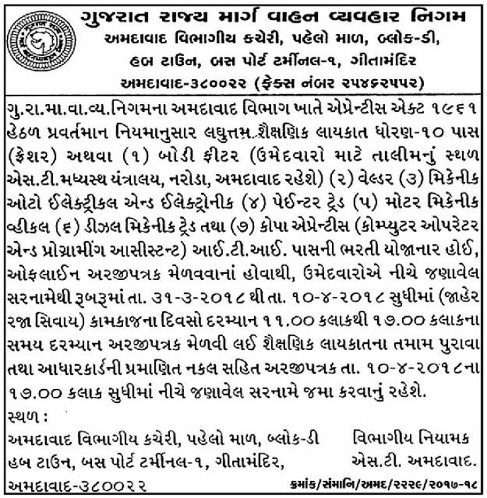 Gujarat State Road Transport Corporation (GSRTC) has published the notification for recruitment for the post of Apprentice Posts  There are a total of  Vacancy in GSRTC Nadiad, Mehsana and Ahmedabad Recruitment for Apprentice Posts 2018. has published Advertisement for below mentioned Posts 2018. Other Details like No.Of Posts, Educational Qualification, Age Limit,  Selection Process, Application fee and How to Apply are given below. Must Read Official Advertisement than Apply for this Post.Best Of Luck. Thanks for Visit Gujarati Education