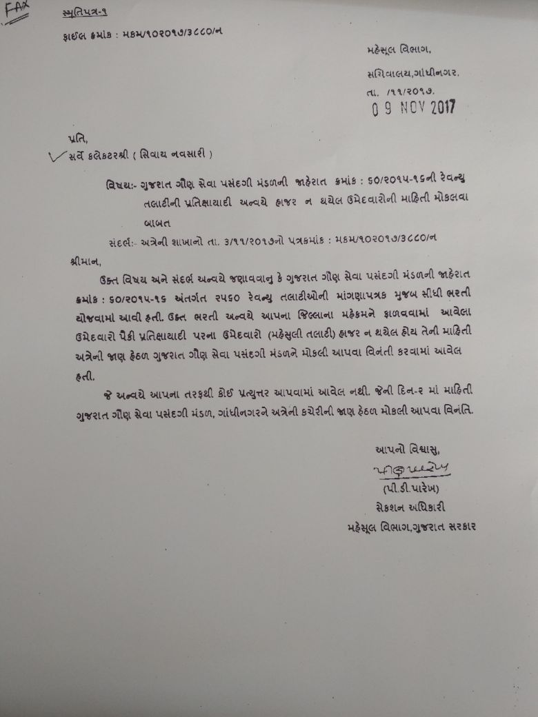 - GSSSB Revenue Talati Waiting Related Important Paripatra 2017