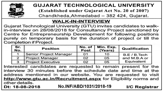 Gujarat Technological University (GTU) Recruitment for Project Manager and Project Executive Posts 2018