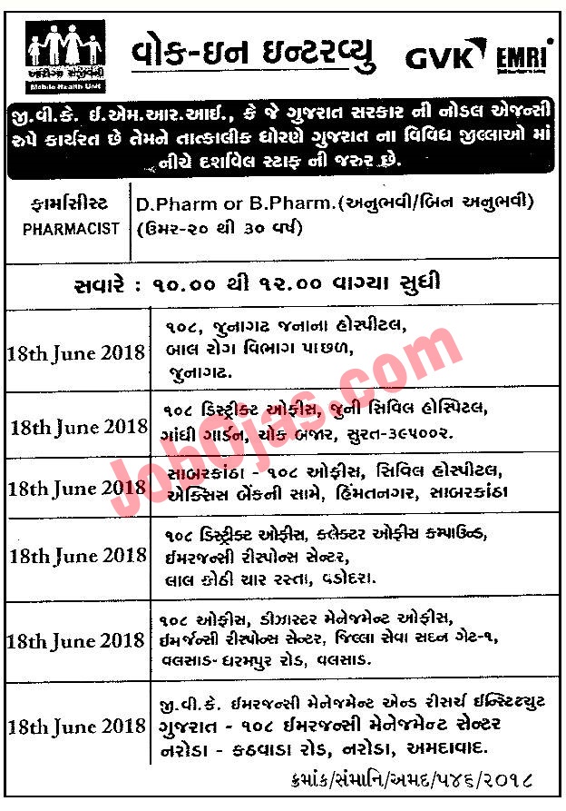 GVK EMRI (Emergency Management & Research Institute) has published the notification for recruitment for the post of Pharmacist Posts There are a total of Vacancy in GVK EMRI 108 Recruitment for Pharmacist Posts 2018. has published Advertisement for below mentioned Posts 2018. Other Details like No.Of Posts, Educational Qualification, Age Limit, Selection Process, Application fee and How to Apply are given below. Must Read Official Advertisement than Apply for this Post.Best Of Luck. Thanks for Visit Gujarati Education