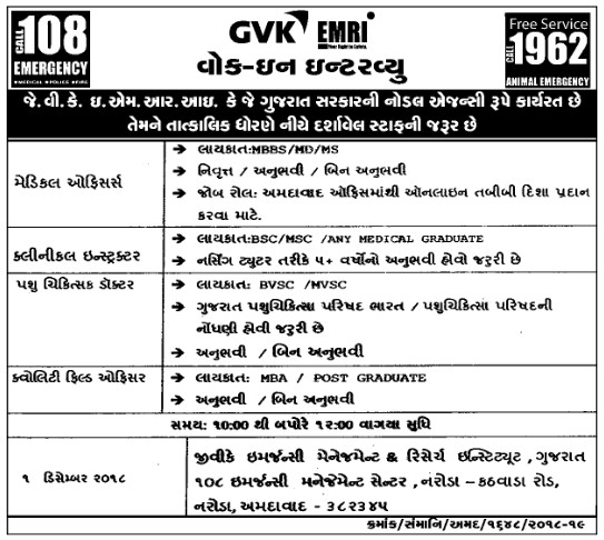 GVK EMRI (Emergency Management & Research Institute) has published the notification for recruitment for the post of Various Posts There are a total of Vacancy in GVK EMRI 108 Recruitment for Various Posts 2018. has published Advertisement for below mentioned Posts 2018. Other Details like No.Of Posts, Educational Qualification, Age Limit, Selection Process, Application fee and How to Apply are given below. Must Read Official Advertisement than Apply for this Post.Best Of Luck. Thanks for Visit Gujarati Education