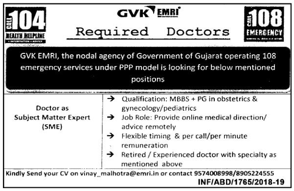 GVK EMRI (Emergency Management & Research Institute) has published the notification for recruitment for the post of Various Posts There are a total of Vacancy in GVK EMRI 108 Recruitment for Various Posts 2018. has published Advertisement for below mentioned Posts 2018. Other Details like No.Of Posts, Educational Qualification, Age Limit, Selection Process, Application fee and How to Apply are given below. Must Read Official Advertisement than Apply for this Post.Best Of Luck. Thanks for Visit Gujarati Education
