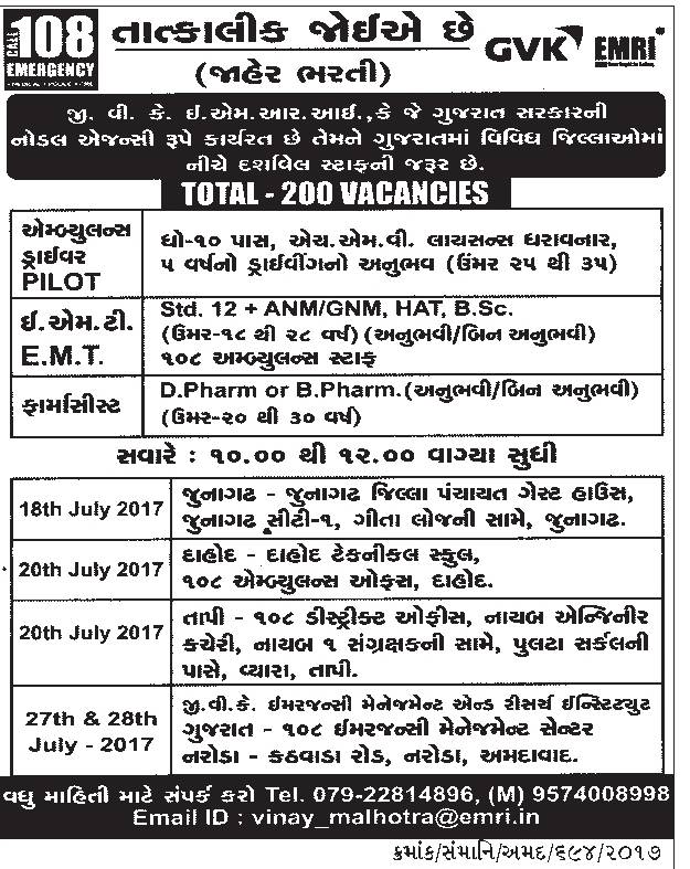 - Ahmedabad : GKV, 108 Emergency Management Centre, Naroda,Kathwada Road,Naroda, Ahmedabad