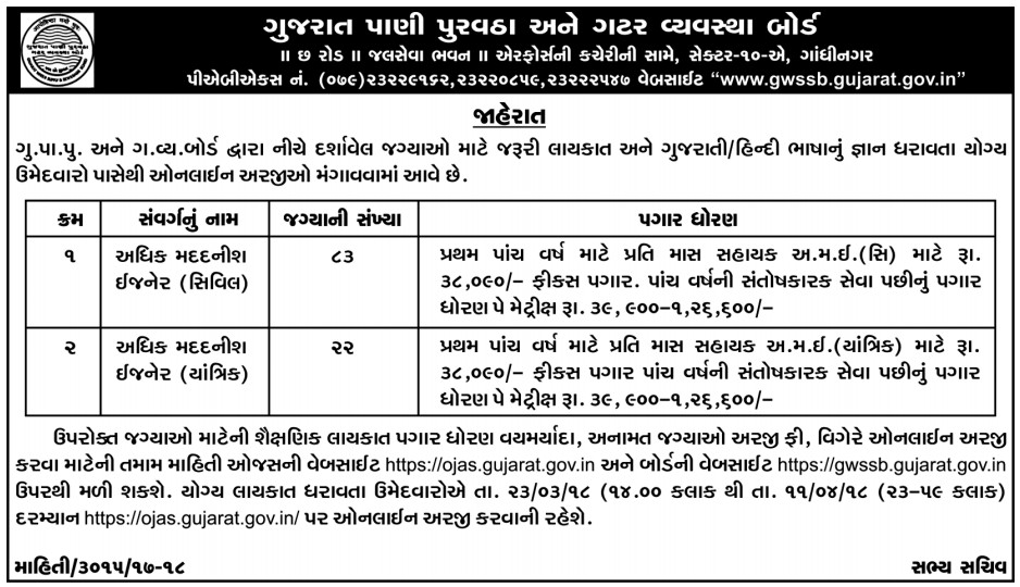 Gujarat Water Supply and Sewerage Board (GWSSB) has published the notification for recruitment for the post of Additional Assistant Engineer (Civil and Mechanical) Posts There are a total of 105 Vacancy in GWSSB Recruitment for 105 Additional Assistant Engineer (Civil and Mechanical) Posts 2018 (OJAS). has published Advertisement for below mentioned Posts 2018. Other Details like No.Of Posts, Educational Qualification, Age Limit, Selection Process, Application fee and How to Apply are given below. Must Read Official Advertisement than Apply for this Post.Best Of Luck. Thanks for Visit Gujarati Education