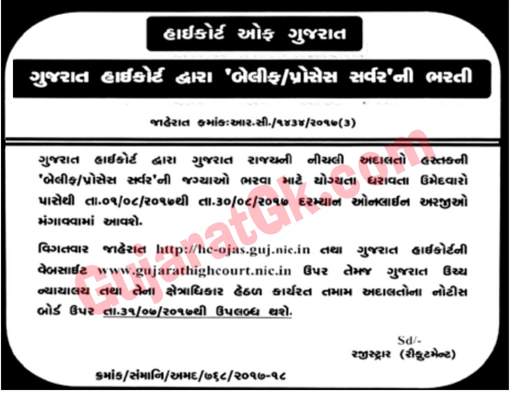 High Court of Gujarat Recruitment for Bailiff and Process Server Posts 2017