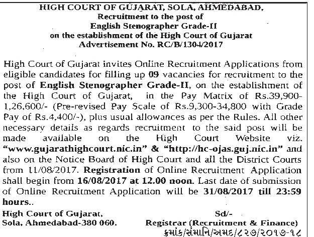 High Court of Gujarat Recruitment English Stenographer Posts 2017