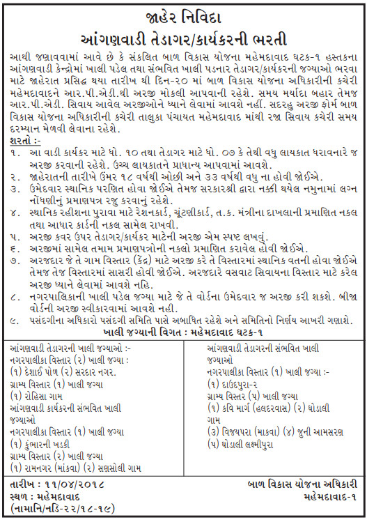 Integrated Child Development Scheme (ICDS)   has published the notification for recruitment for the post of Anganwadi Worker and Helper Posts  There are a total of  Vacancy in ICDS Mahemdavad Recruitment for Anganwadi Worker and Helper Posts 2018. has published Advertisement for below mentioned Posts 2018. Other Details like No.Of Posts, Educational Qualification, Age Limit,  Selection Process, Application fee and How to Apply are given below. Must Read Official Advertisement than Apply for this Post.Best Of Luck. Thanks for Visit Gujarati Education