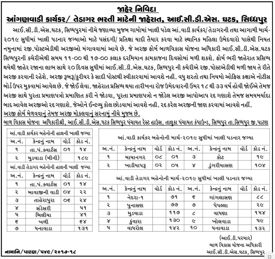 ICDS Siddhpur Recruitment for Anganwadi Worker and Helper Posts 2018