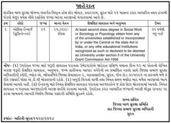 ICPS Surat has published the notification for recruitment for the post of Officer Incharge Superintendent There are a total of 01 Vacancy in ICPS Surat Recruitment for Officer Incharge Superintendent Post 2018. has published Advertisement for below mentioned Posts 2018. Other Details like No.Of Posts, Educational Qualification, Age Limit, Selection Process, Application fee and How to Apply are given below. Must Read Official Advertisement than Apply for this Post.Best Of Luck. Thanks for Visit Gujarati Education