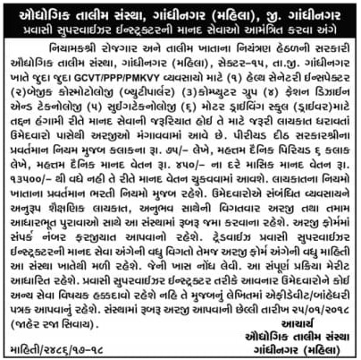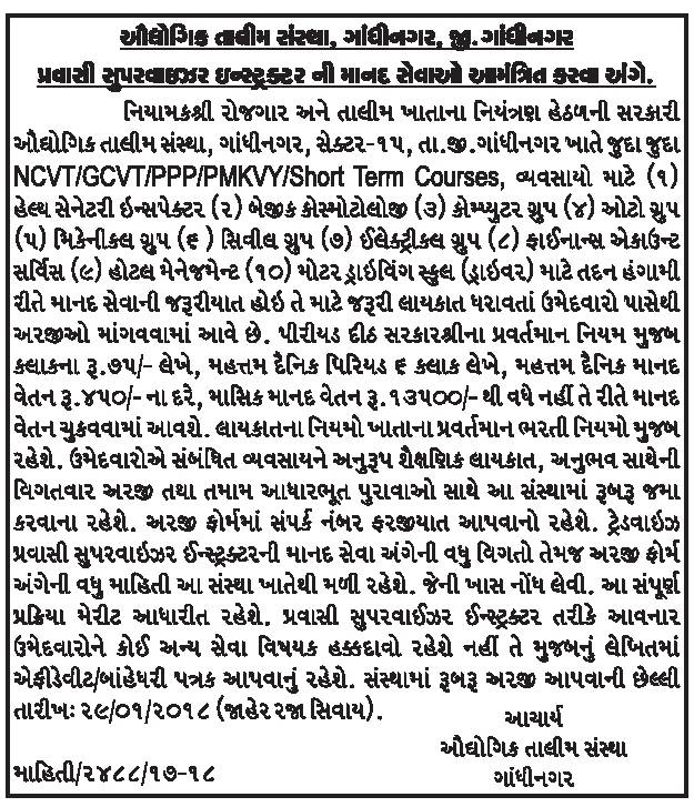 ITI Gandhinagar Recruitment for Pravasi Supervisor Instructor Posts 2018