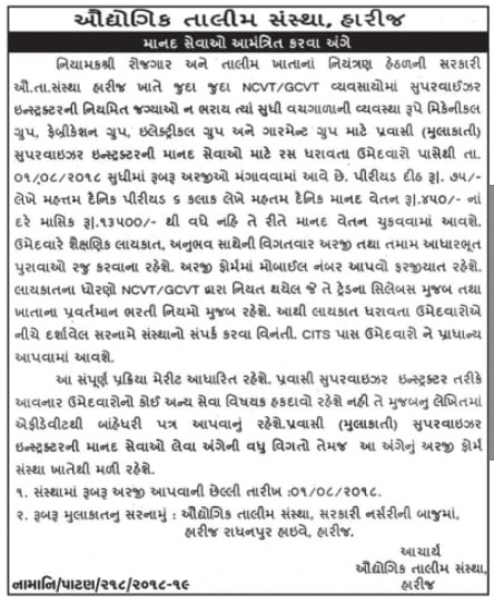 ITI Harij Recruitment for Pravasi Supervisor Instructor Posts 2018