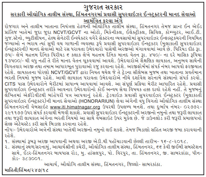 ITI Himatnagar Recruitment for Pravasi Supervisor Instructor Posts 2018