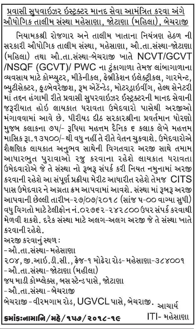 ITI Mahesana Jotana (Women) has published the notification for recruitment for the post of Supervisor Instructor Posts There are a total of Vacancy in ITI Mahesana Jotana (Women) Recruitment for Pravasi Supervisor Instructor Posts 2018. has published Advertisement for below mentioned Posts 2018. Other Details like No.Of Posts, Educational Qualification, Age Limit, Selection Process, Application fee and How to Apply are given below. Must Read Official Advertisement than Apply for this Post.Best Of Luck. Thanks for Visit Gujarati Education