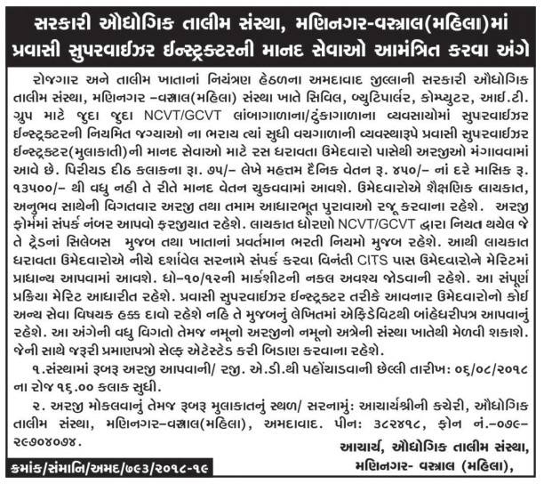 ITI Maninagar- Vastral (Women) has published the notification for recruitment for the post of Supervisor Instructor Posts There are a total of Vacancy in ITI Maninagar- Vastral (Women) Recruitment for Pravasi Supervisor Instructor Posts 2018. has published Advertisement for below mentioned Posts 2018. Other Details like No.Of Posts, Educational Qualification, Age Limit, Selection Process, Application fee and How to Apply are given below. Must Read Official Advertisement than Apply for this Post.Best Of Luck. Thanks for Visit Gujarati Education