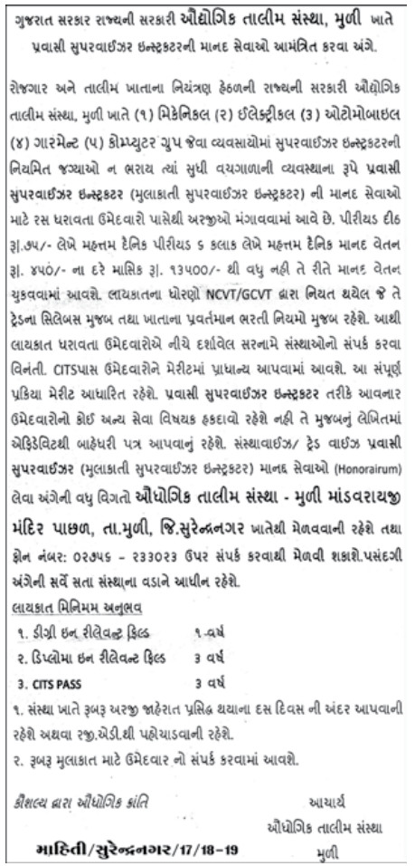 ITI Kubernagar, Ahmedabad has published the notification for recruitment for the post of Supervisor Instructor Posts There are a total of Vacancy in ITI Muli Recruitment for Supervisor Instructor Posts 2018. has published Advertisement for below mentioned Posts 2018. Other Details like No.Of Posts, Educational Qualification, Age Limit, Selection Process, Application fee and How to Apply are given below. Must Read Official Advertisement than Apply for this Post.Best Of Luck. Thanks for Visit Gujarati Education