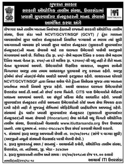 ITI Utarsanda Recruitment for Pravasi Supervisor Instructor Posts 2018