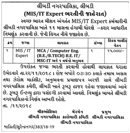 Limbdi Nagarpalika Recruitment for MIS/ IT Expert Post 2018
