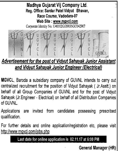 Madhya Gujarat Vij Company Limited (MGVCL) MGVCL Centralised Recruitment for Vidyut Sahayak – Junior Assistant & Vidyut Sahayak (Junior Engineer – Electrical) behalf of UGVCL, DGVCL, PGVCL, MGVCL, GSECL and GUVNL