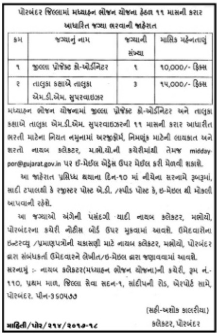 Mid Day Meal Project (Madhyahan Bhojan) Porbandar Recruitment for Coordinator and Supervisor Posts 2018