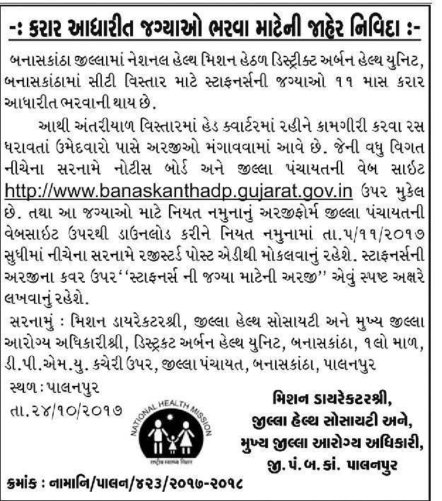 NHM Banaskantha Recruitment For Staff Nurse Posts 2017