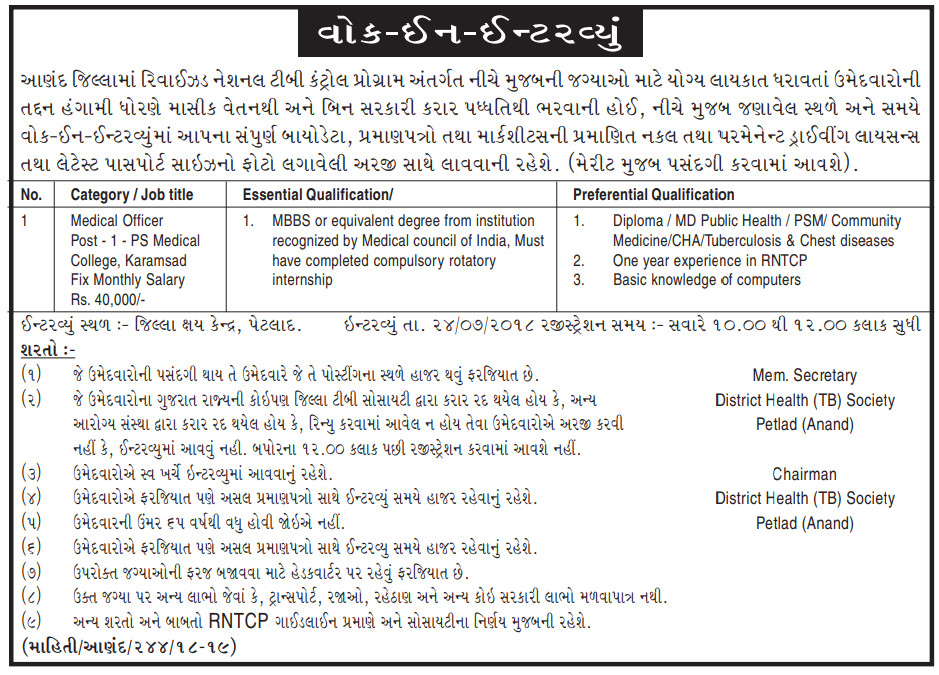 Revised National Tuberculosis Control Program (RNTCP) Anand Recruitment for Medical Officer Post 2018