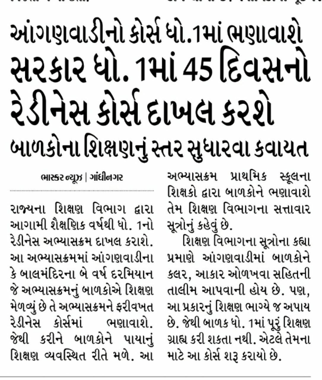 SARKARI PRATHMIK SHALA MA STD 1 MA NAVA VARSH THI 45 DIVAS NO READYNESS COURSE DAKHAL KARASHE:- NEWS REPORT.