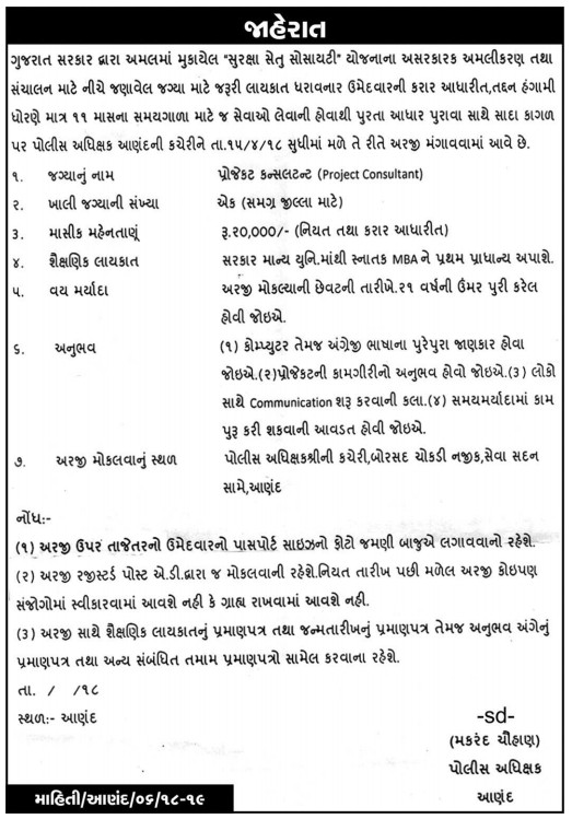 Suraksha Setu Society, Anand Recruitment for Project Consultant Post 2018