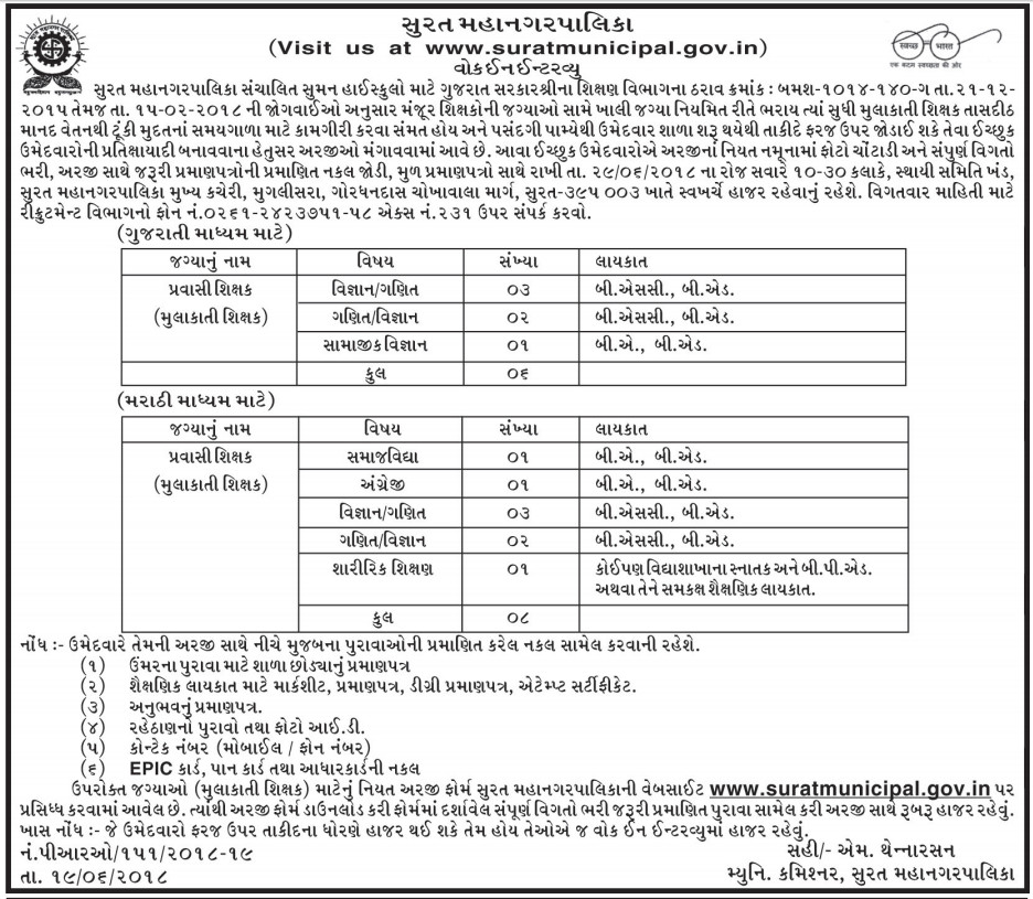Surat Municipal Corporation (SMC) Recruitment for Pravasi Teacher Posts 2018