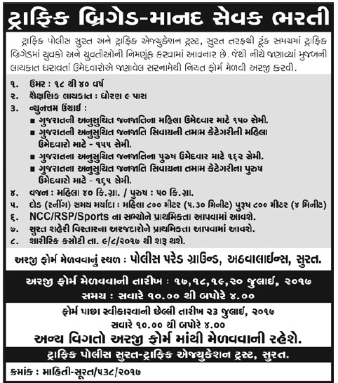 Surat Traffic Education Trust Recruitment For Traffic Brigade 2017