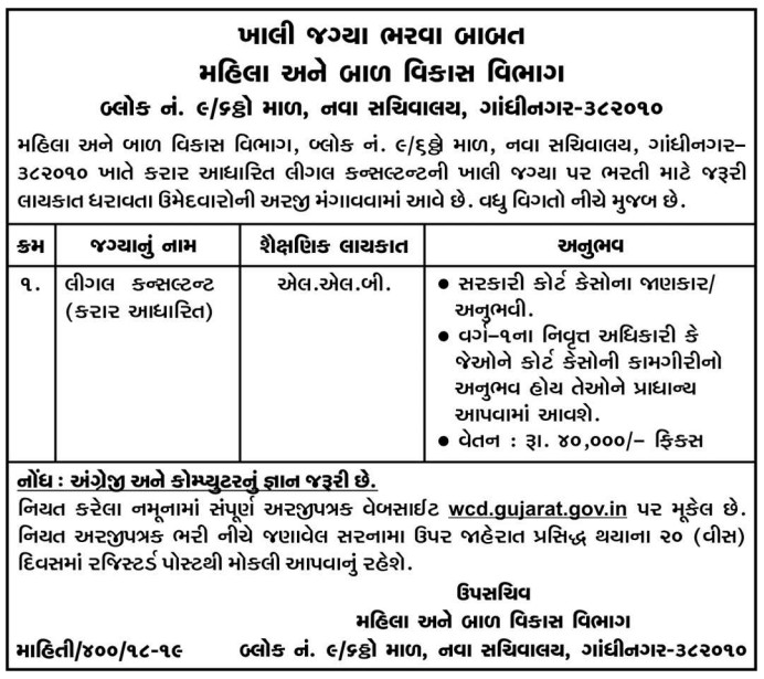 Women and Child Development Department, Gujarat Recruitment for Legal Consultant Post 2018